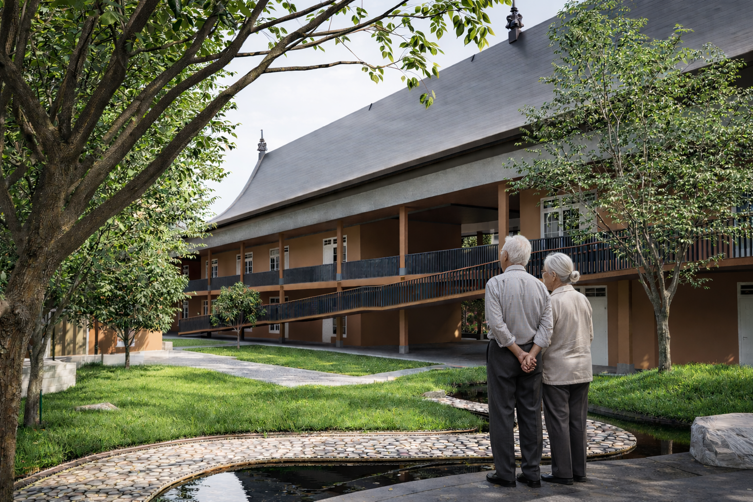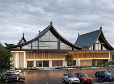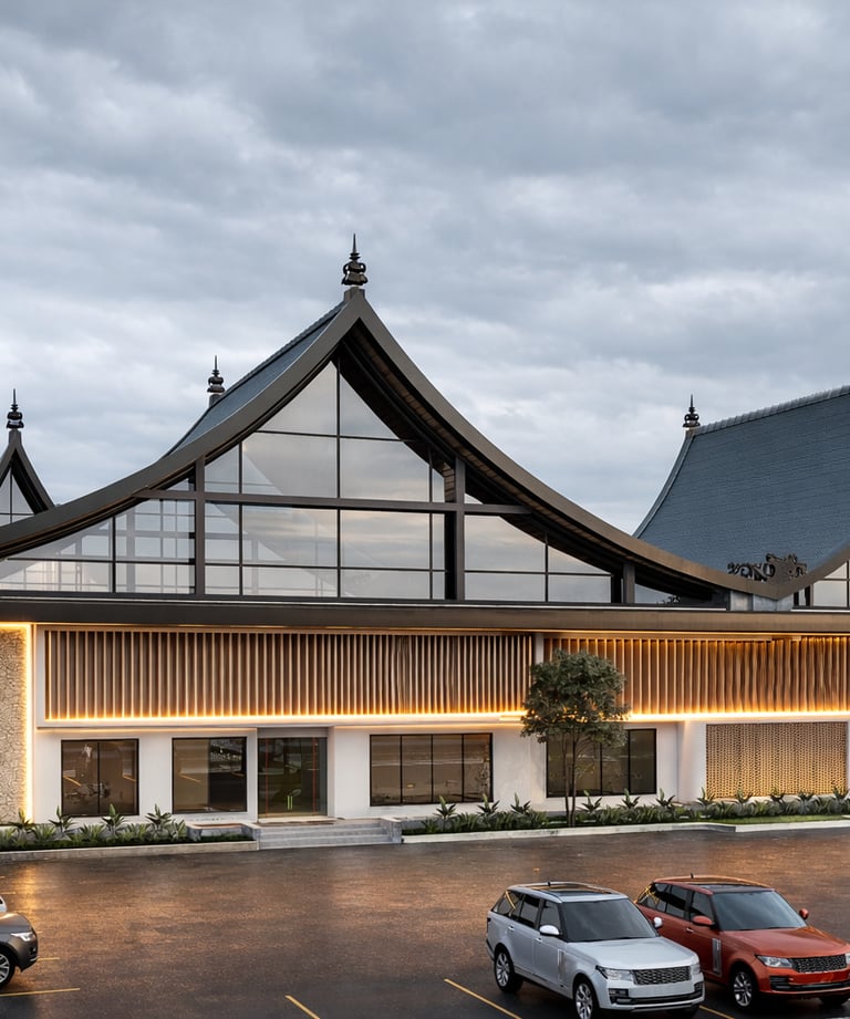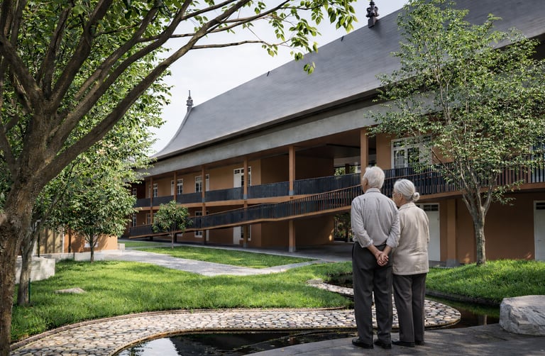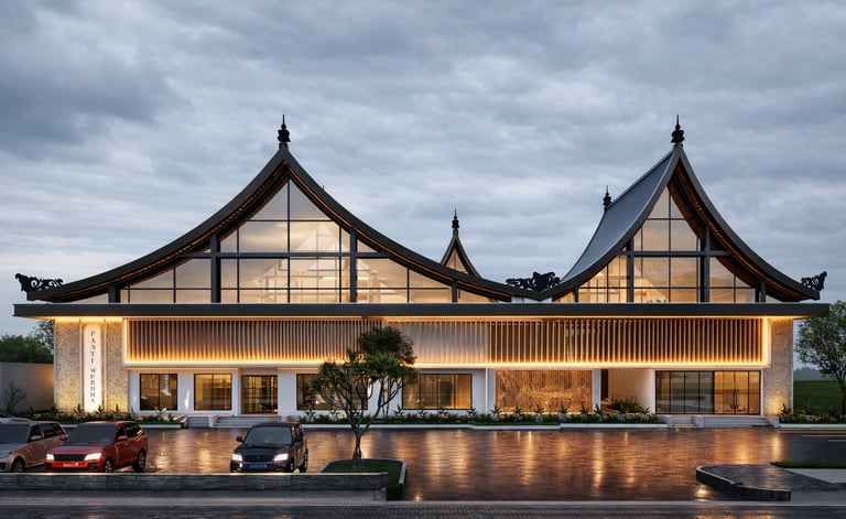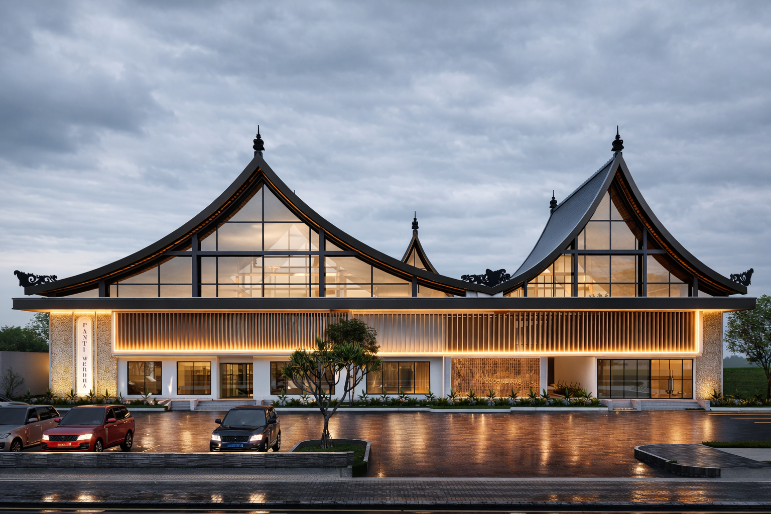 Panti werdha ini dirancang dengan konsep modern vernakular, menggabungkan keindahan arsitektur tradisional Nusantara dengan pendekatan desain kontemporer yang elegan. Bentuk atap yang ikonik menghadirkan identitas budaya yang kuat, sementara fasad modern dengan elemen kaca dan kisi-kisi kayu menciptakan kesan hangat, terbuka, dan ramah.