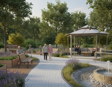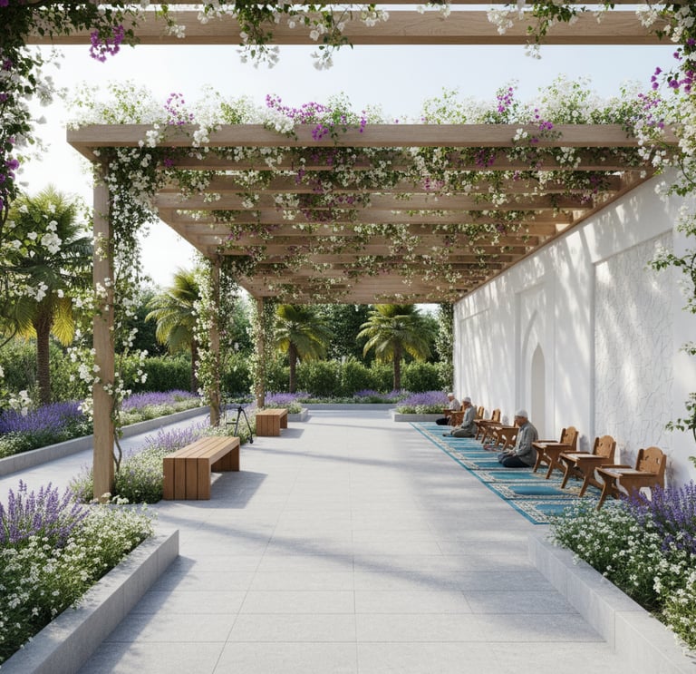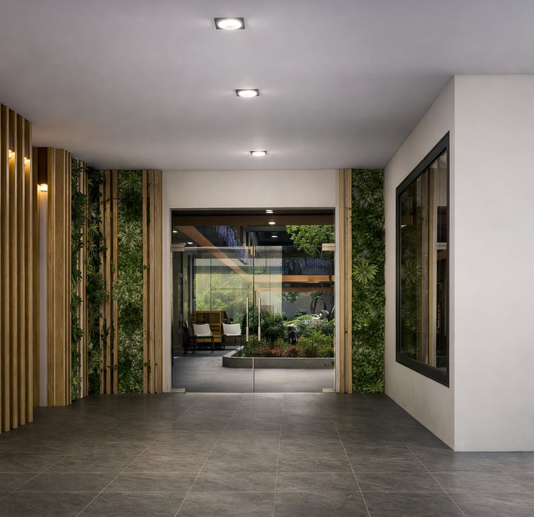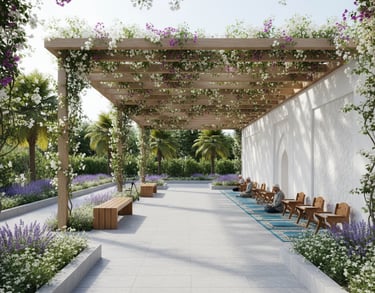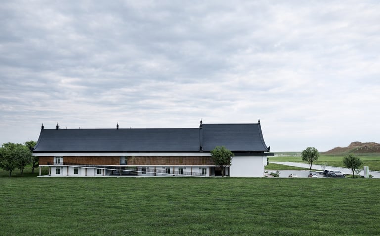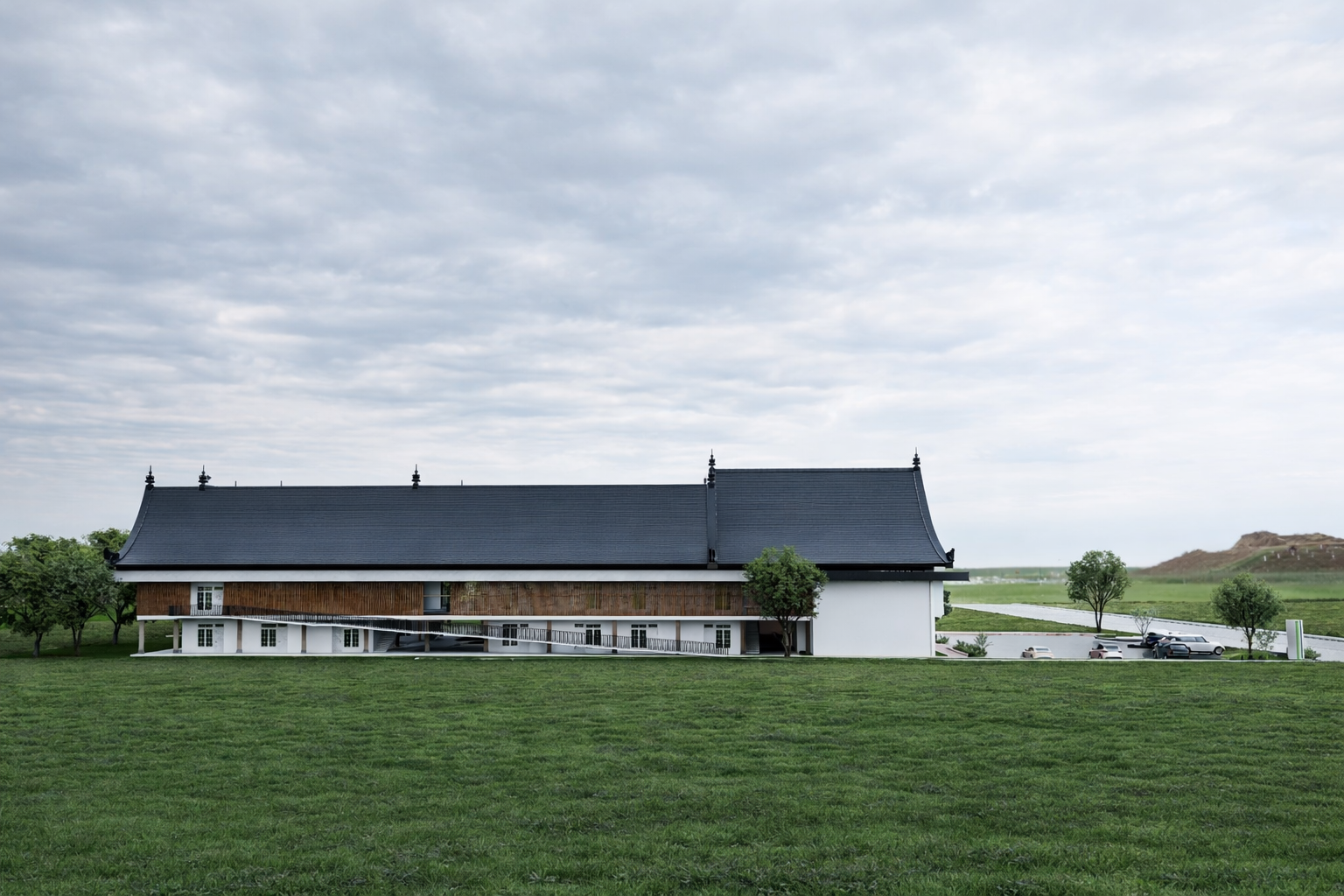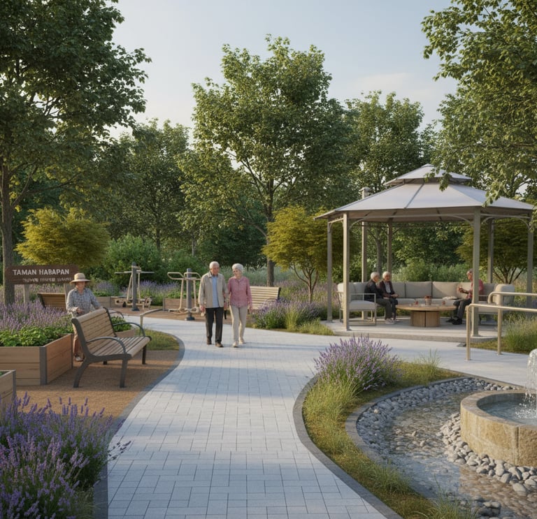 Panti werdha ini dirancang dengan konsep modern vernakular, menggabungkan keindahan arsitektur tradisional Nusantara dengan pendekatan desain kontemporer yang elegan. Bentuk atap yang ikonik menghadirkan identitas budaya yang kuat, sementara fasad modern dengan elemen kaca dan kisi-kisi kayu menciptakan kesan hangat, terbuka, dan ramah.