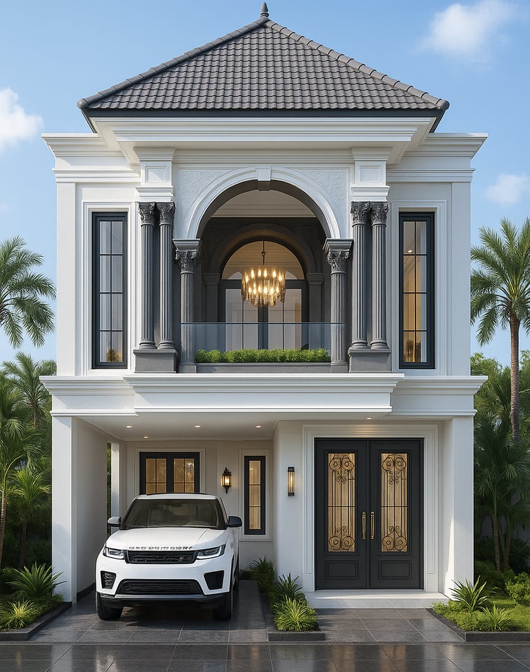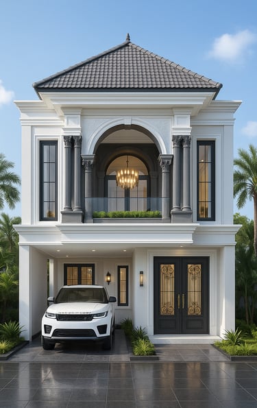 Desain rumah ini mengusung konsep klasik modern yang menonjolkan kemewahan, proporsi simetris, dan detail arsitektural yang kuat. Tampilan fasad didominasi warna putih bersih yang memberikan kesan elegan, dipadukan dengan aksen gelap pada kolom dan kusen untuk menciptakan kontras yang tegas dan berkelas.