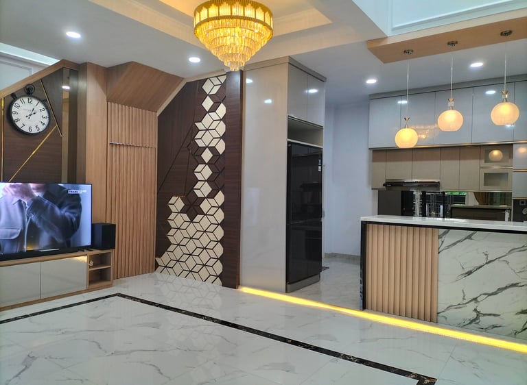Dominasi warna putih dipadukan secara apik dengan panel kayu linier (horizontal). Sentuhan kayu ini berfungsi untuk "menghangatkan" suasana, memastikan rumah tidak terasa dingin meski bergaya minimalis.