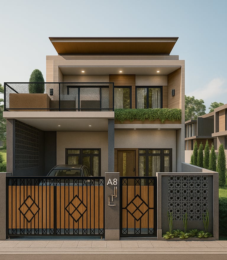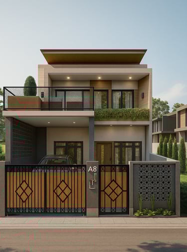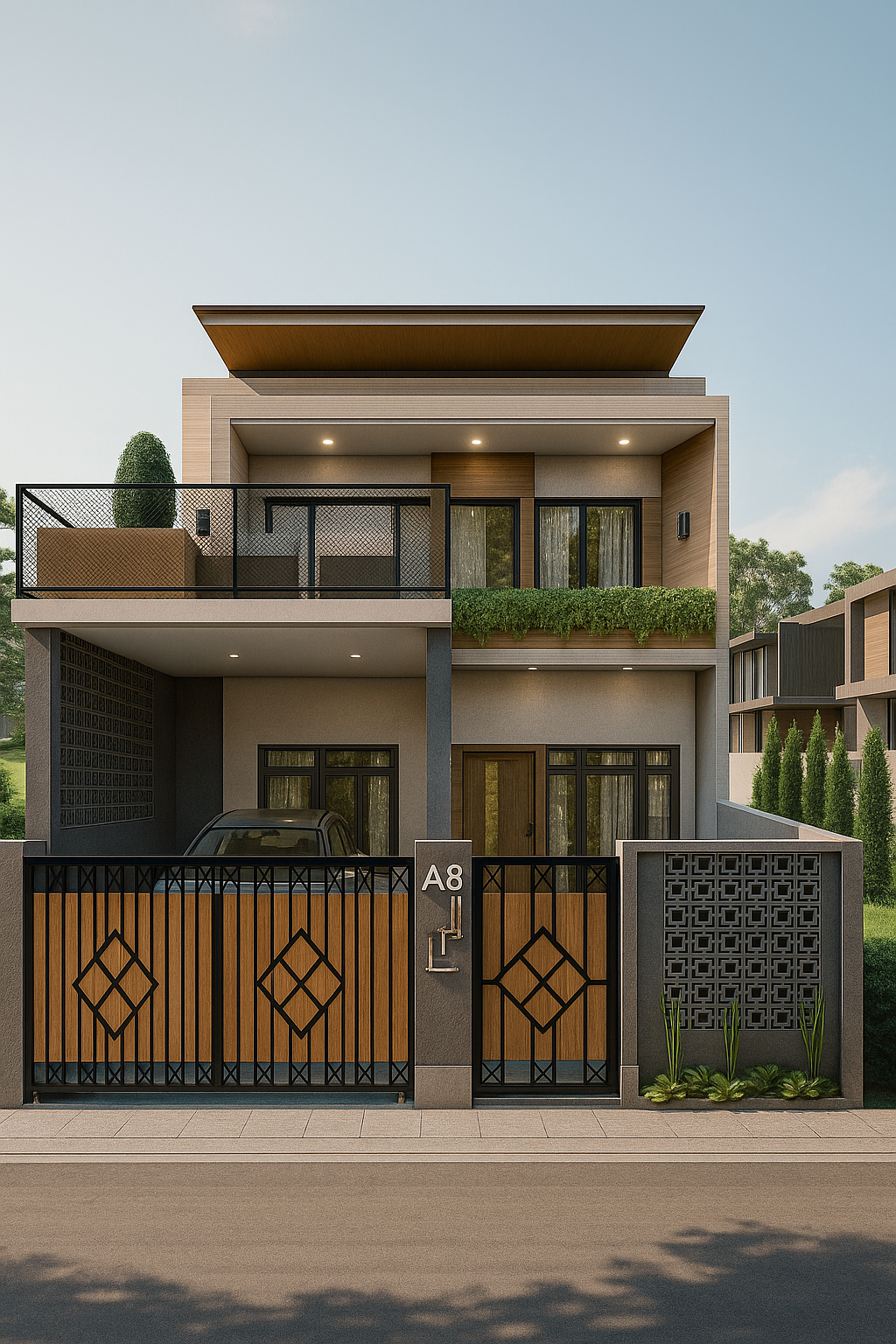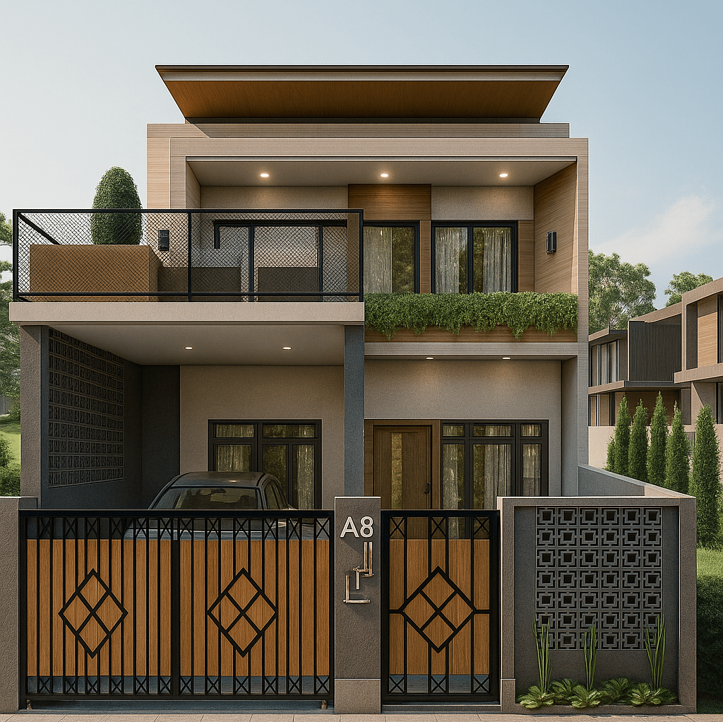 Hunian Rumah dua lantai ini mengusung konsep Modern Minimalist Architecture yang mengedepankan kehangatan material alami dalam balutan geometri modern yang tegas. Desain ini dirancang khusus untuk menciptakan suasana rumah yang tenang, sejuk, dan tetap terlihat sangat modis di lingkungan perkotaan.